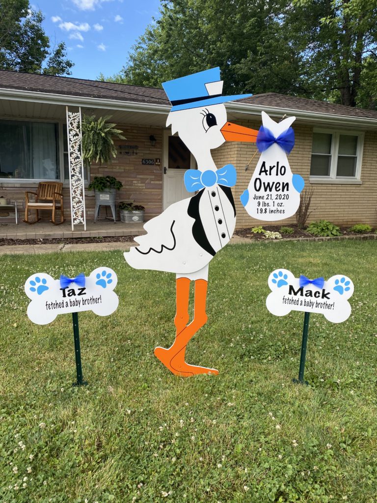 There is nothing more joyous than bringing home a new baby! Let Stork & Co welcome your baby home with an adorable stork lawn announcement. Our service is similar in cost to sending flowers but is a more unique and thoughtful way to show your love to the new family. Storks come with a darling customized keepsake bundle!