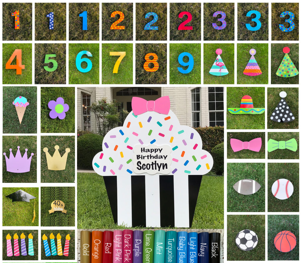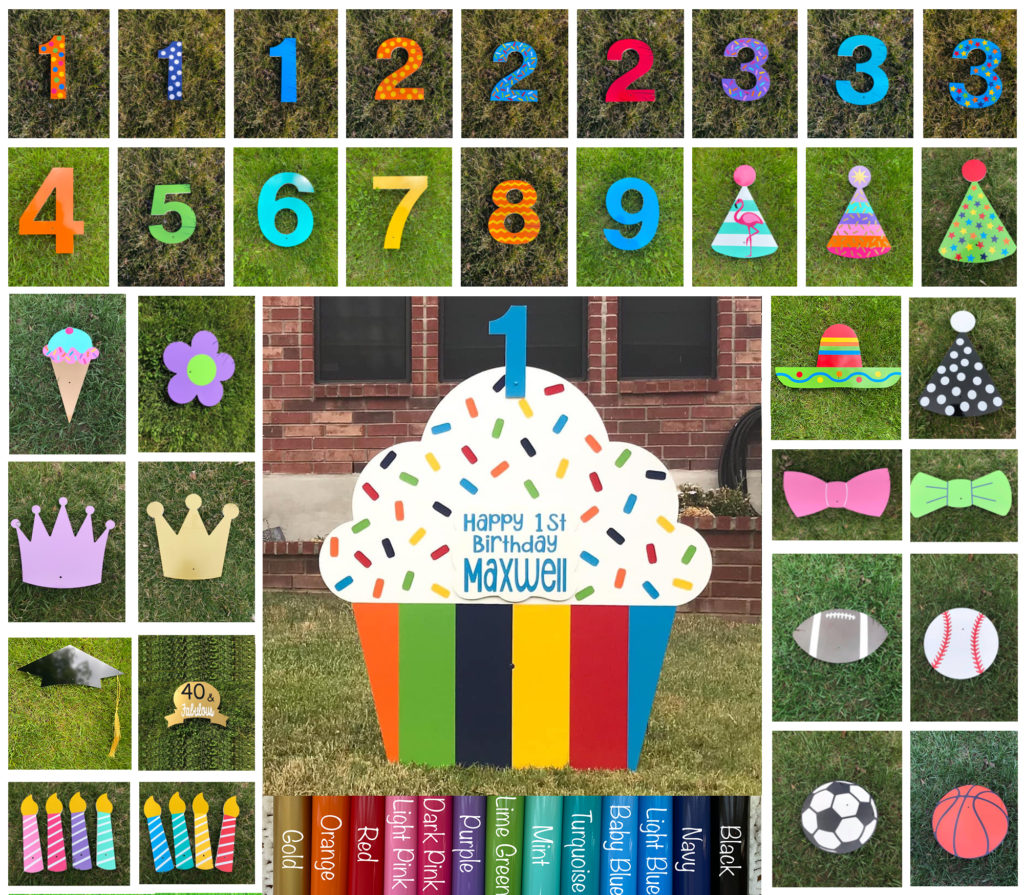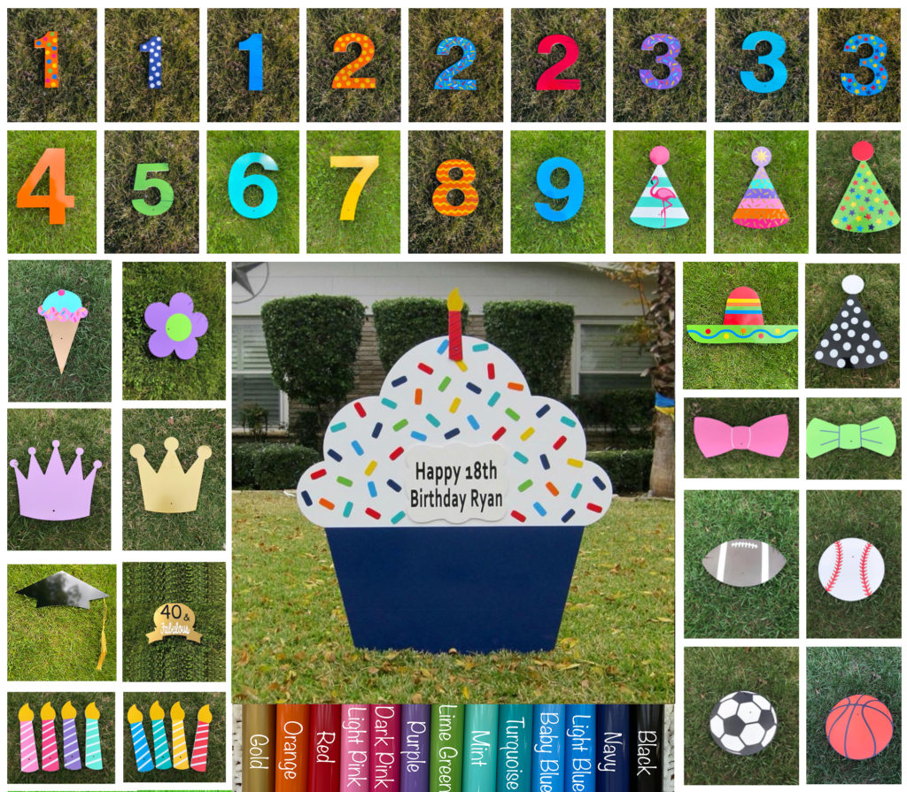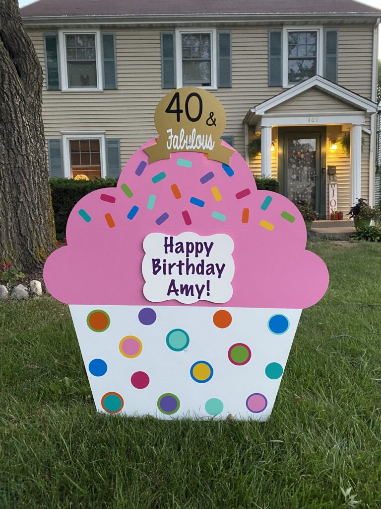 Our cupcake and flamingo signs are an over-sized, unique way to celebrate someone special! Special occasions are endless. Think about a baby’s 1st birthday, your grandmother’s 90th, milestone birthdays like 13th (Thirteenth), Sweet 16, 18th (Eighteenth), 21st (Twenty-First), 30th (Thirtieth), 40th (Fortieth), 50th (Fiftieth), 60th (Sixtieth), 70th (Seventieth), 80th (Eightieth), 90th (Ninetieth) and 100th (One Hundredth), over the hill or any number, all birthdays are important! Cupcakes can also be used for retirements, anniversaries, employee of the month, engagements, a bride to be and anything worth celebrating!