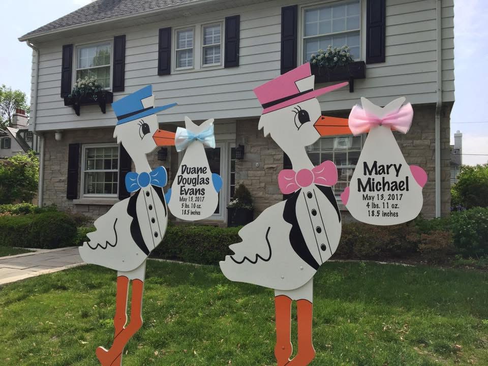 The 6 ft. stork yard signs are pink or blue and the customized keepsake bundle can include as much or as little information as you’d like. Typical bundles include first and middle name, date, weight, and length. Whether baby girl or boy, we look forward to helping you celebrate!